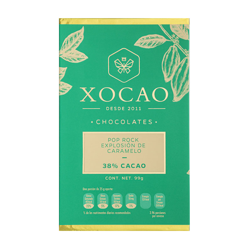 Barra de chocolate 100% mexicano elaborado artesanalmente, con ingredientes naturales y con el mejor cacao criollo. Contiene cacao al 38% y también deliciosos trozos de caramelo (pop rocks) que explotan en tu boca.